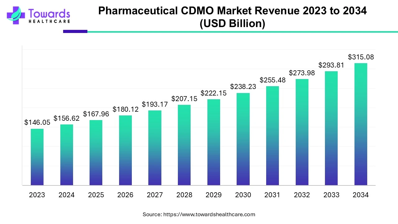 The global pharmaceutical CDMO market size was estimated at US$ 146.05 billion in 2023 and is projected to grow to US$ 315.08 billion by 2034, rising at a compound annual growth rate (CAGR) of 7.24% from 2024 to 2034. The pharmaceutical CDMOs are growing due to the growing demand for pharmaceutical products.