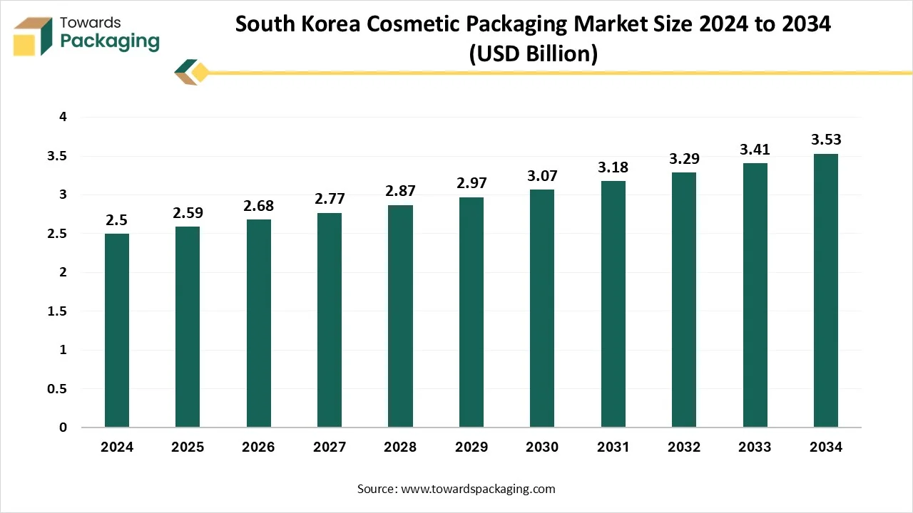 According to researchers from Towards Packaging, the global South Korea cosmetic packaging market, estimated at USD 2.59 billion in 2025, is forecast to expand to USD 3.53 billion by 2034, growing at a CAGR of 3.5% over the forecast period.